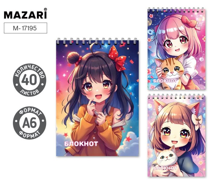 Блокнот А6, 40 л., обложка картон, блок офсет, клетка, на спирали, ассорти 3 дизайна