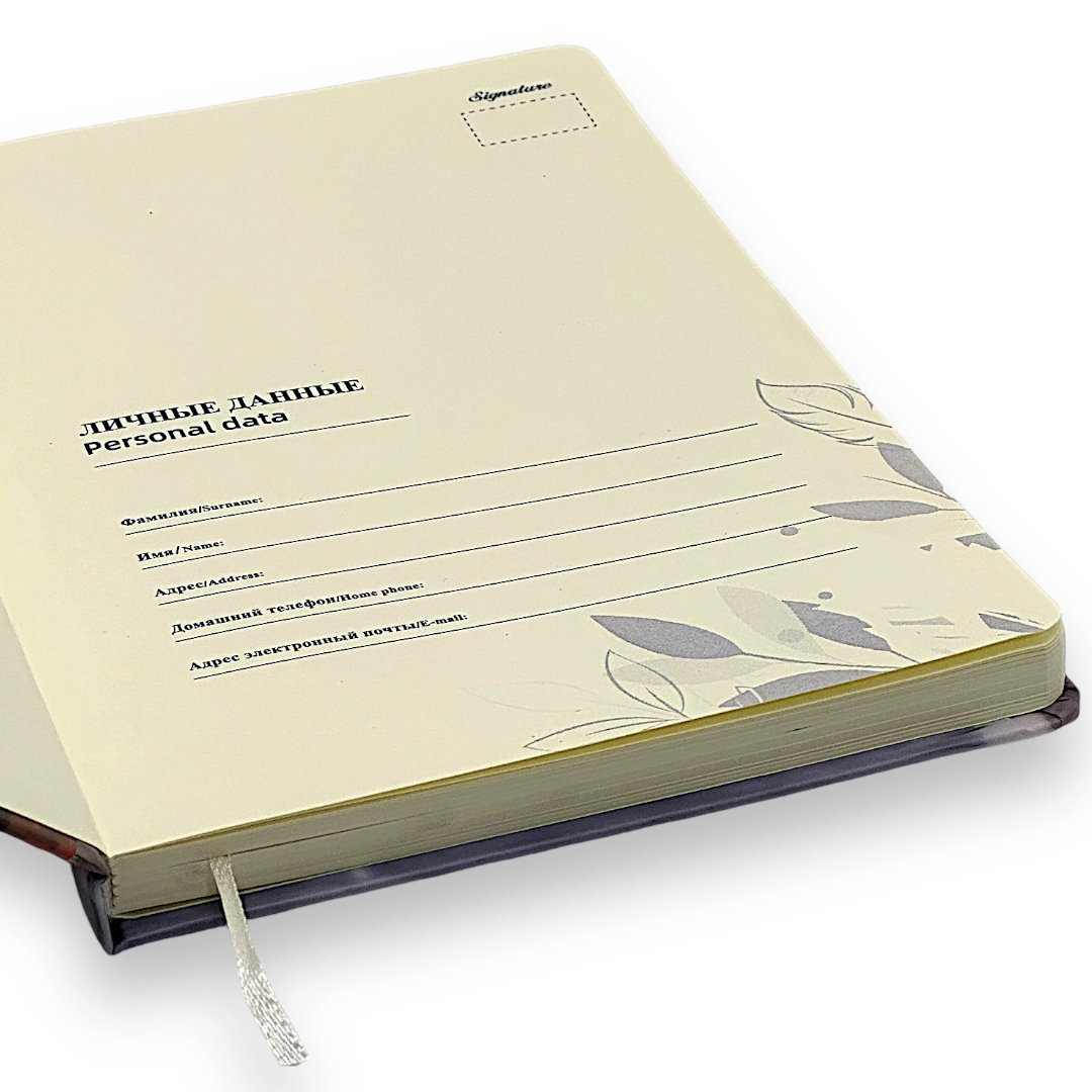 Недатированный ежедневник формата А5. 80 листов в клетку, кремовая бумага. Твердая книжная обложка, снабжена резинкой-фиксатором. Цвет и рисунок обложки в ассортименте, 4 варианта.