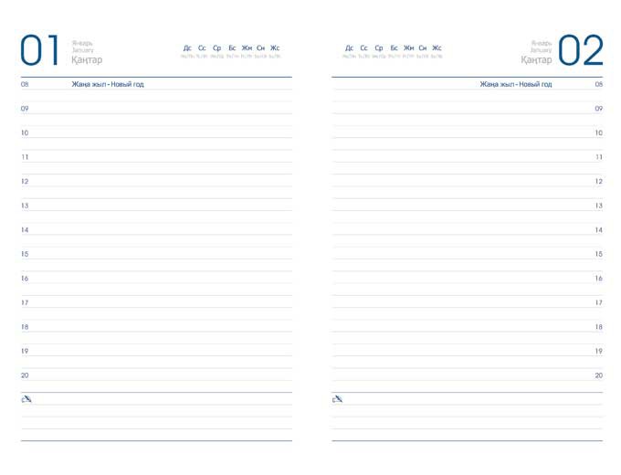 Полудатированный ежедневник A5 формата, размер обложки 148x215 мм, прошит по краю обложки. Размер внутреннего блока 144x208 мм. 400 страниц. Полностью адаптирован для РК. Полезная информация: мировые стандарты праздники конвертация метрик и т.д. Бумага 70 гр. цвет кремовый. Ляссе под цвет обложки. На форзаце карта Казахстана, на эрзаце карта Евразии.