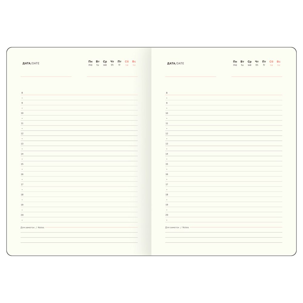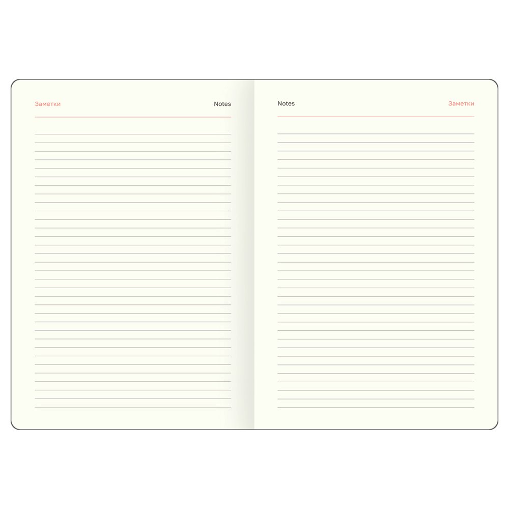 Формат – А5 (145*205 мм). Изделие состоит из 136 листов тонированной бумаги плотностью 70 г/м2, которая подходит для любых типов ручек и не будет просвечиваться. В линованный блок с полем для даты удобно записывать встречи, идеи и задачи.
