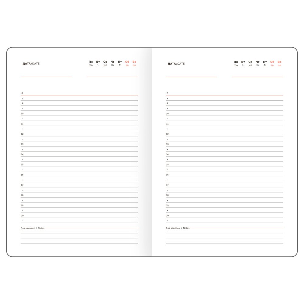 Изделие состоит из 136 листов белой бумаги плотностью 70 г/м2, которая подходит для любых типов ручек и не будет просвечиваться. В линованный блок с полем для даты и почасовым планингом удобно записывать встречи, идеи и задачи.