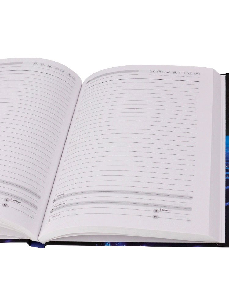 Удобный формат А5 (150х204 мм), внутренний блок — 128 листов, недатированный, твёрдая обложка 7БЦ, украшенная софт-тач ламинацией и глянцевым песком.