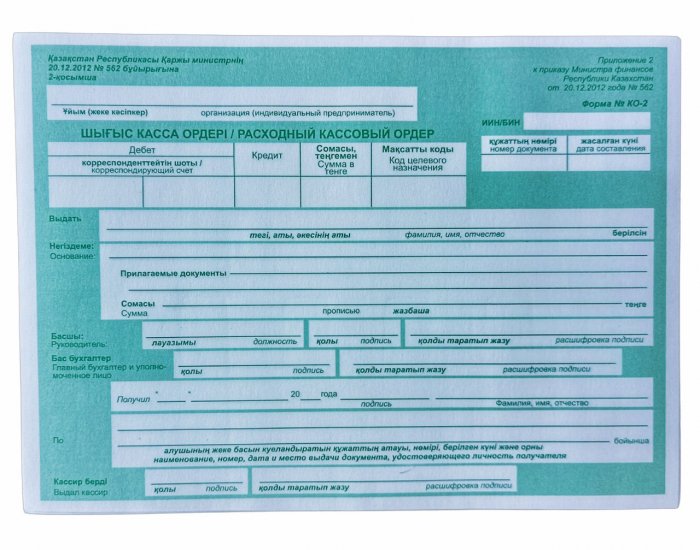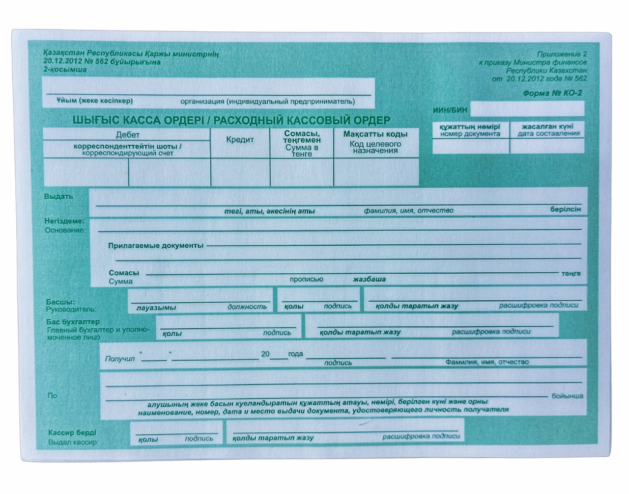 Бухгалтерские бланки — расходный кассовый ордер. Применяются для учета и оформления кассовых операций на предприятии. Бланки отпечатаны на офсетной бумаге формата А5, склеены по 65 штук в виде книжки. Страна-производитель - Казахстан.