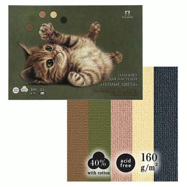 Планшет состоит из 15 листов и 5 цветов пастельной бумаги с жесткой подложкой из переплетного картона. Бумага внутреннего блока имеет плотность 160 г/м2, cостоит из 40 % хлопкового волокна,