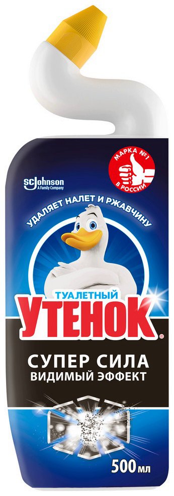 Чистящее средство для унитазов Туалетный Утенок гель Суперсила Видимый эффект 500 мл. Суперэффективная формула Туалетный Утенок Суперсила Видимый эффект справляется с самыми сложными проблемами: удаляет самые стойкие пятна, включая ржавчину и известковый налет; глубокое очищение даже под водой. Меняет цвет во время очищения. Обеспечивает: максимальное очищение; дезинфицирующий эффект - убивает 99,9% микробов; удаление налета и ржавчины; устранение неприятных запахов; свежий аромат.
