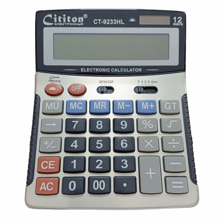 Настольный калькулятор Cititon CT-9233HL. 12-ти разрядный дисплей. Двойное питание. Пластиковые кнопки. Специальные функции: расчет торговой наценки, итоговая сумма, клавиша "00", смена знака, удаление последнего введенного символа, вычисление процентов, квадратный корень.
