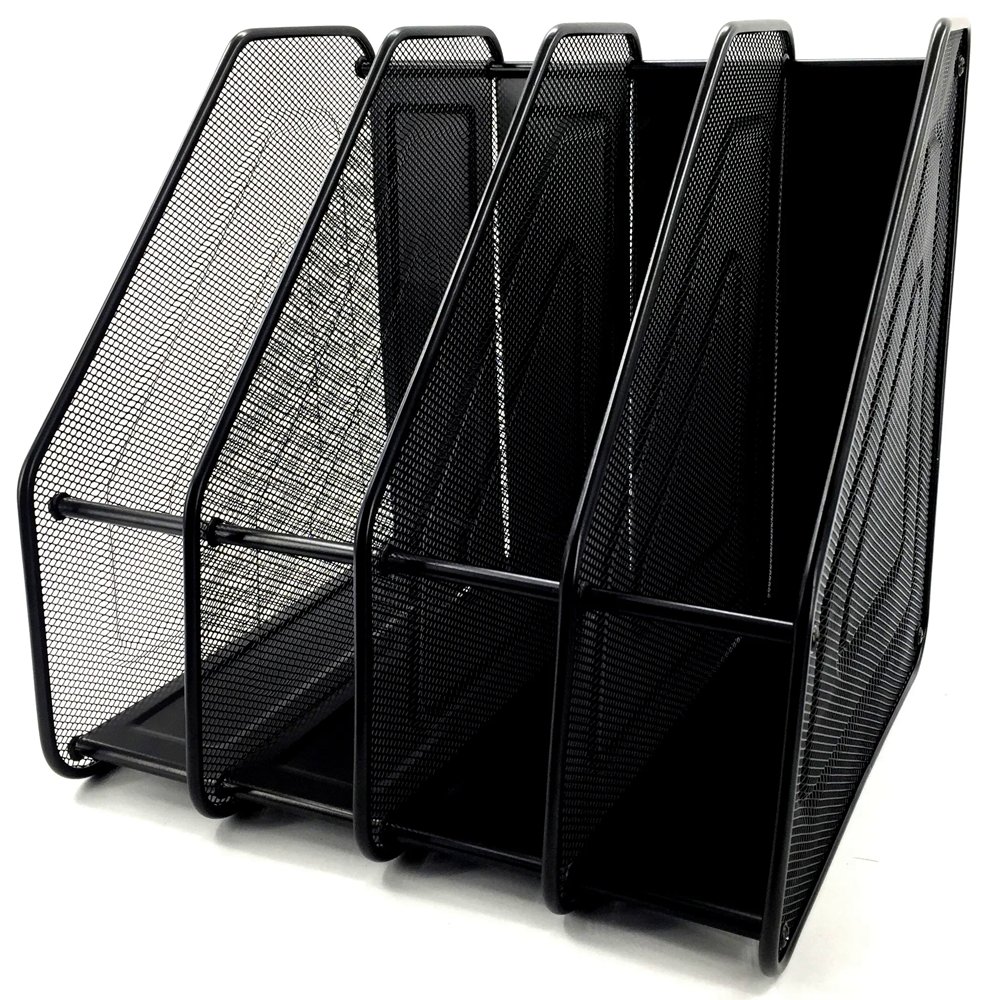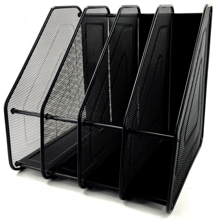 Вместительный и прочный вертикальный лоток отлично подходит для хранения бумаг, документов или журналов. 4 широкие секции позволят разместить большое количество бумаг и разделить их по тематике. Органайзер изготовлен из прочной стали чёрного цвета. Выглядит солидно и основательно, будет хорошо смотреться как на рабочем столе в офисе, так и в домашнем кабинете.