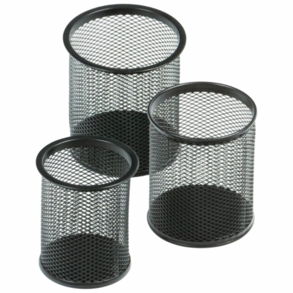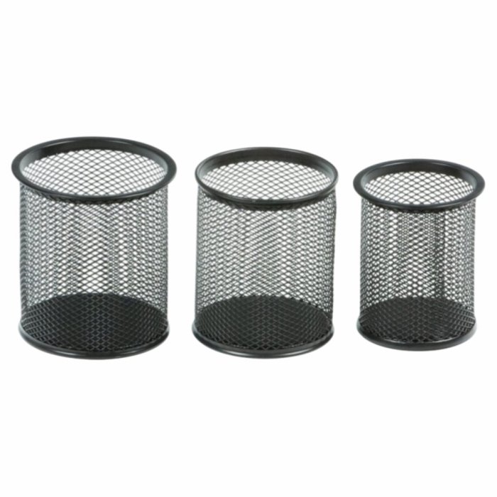 Набор из 3-х офисных стаканов для пишущих принадлежностей (9,5x9,5x10 см, 8х8х9,8 см, 7,5х7,5х8 см). Круглые, сетчатые, металлические, черные. Впишутся в любой интерьер на рабочем столе и будут незаменимыми помощниками для хранения письменных принадлежностей.
