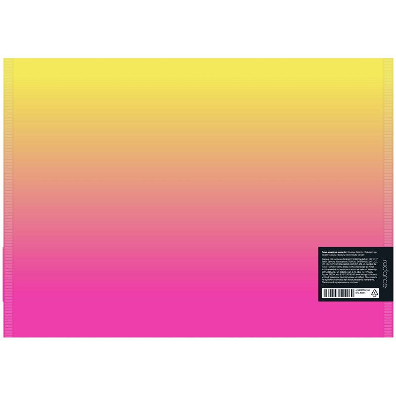 Папка-конверт Berlingo серии Radiance формата А4 на кнопке станет стильным аксессуаром для работы и учебы. Папка размером 330*235 мм изготовлена из высококачественного полипропилена с жёлтым/розовым градиентом и толщиной 180 мкм с матовой текстурой поверхности "песок", на которой не видно отпечатков пальцев и мелких царапин. Предназначена для хранения и переноски документов, предотвращает их смятие и загрязнение. Индивидуальная наклейка на каждом конверте со штрих-кодом и общей информацией. Имеет вертикальную ориентацию. Изделие обеспечивает быстрый доступ к документам.
