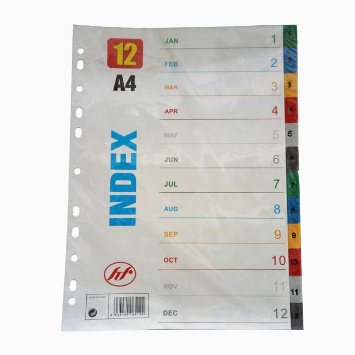 Набор разделителей из пластика с универсальной вырубкой. Формат А4, 11 отверстий. Индексация цифровая и цветовая, 12 листов, 6 различных цветов. Обеспечивают сохранность и аккуратность листов. Удобны в использовании с папками-регистраторами и на кольцах.