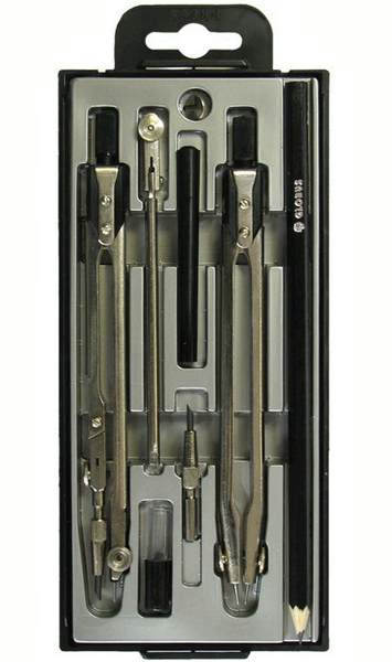 Готовальня - 8 предметов: циркуль стальной никелированный, циркуль разметочный, пенал с запасным грифелем, карандашная вставка, ручка, удлинитель, запасной винт, карандаш черно-графитный. Предназначена для профессиональных работ. Упаковка - инструмент уложен в футляр с прозрачной крышкой на флокированный ложемент. Длина циркуля - 155 мм.