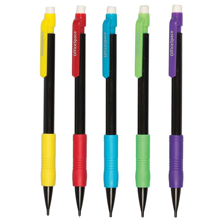 Механический карандаш OfficeSpace в пластиковом прозрачном корпусе с диаметром грифеля 0,5 мм и твердостью НВ. Длина карандаша 15 см, диаметр 8 мм, форма корпуса – круглая. Карандаш снабжён резиновым грипом пяти различных цветов и встроенным ластиком, при нажатии на который происходит подача грифеля. Упакованы в коробку по 24 штуки, 5 ярких цветов корпуса ассорти. Грифели в комплект не входят.