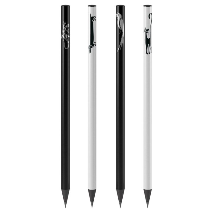 Чернографитный карандаш из черного дерева, с заточкой. Подходит для черчения и рисования. Диаметр грифеля 2,2мм, твердость HB, круглая форма, штрих-код на корпусе. Контрастная черно-белая печать на корпусе силуэтами животных, ассорти 4 дизайна. Упаковка в тубу по 72шт.