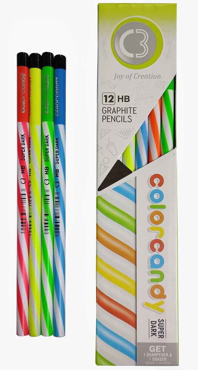 Карандаш чернографитный в деревянном круглом корпусе. Простой карандаш без ластика поставляется не заточенным. Корпус окрашен различными цветами в яркую полоску. Грифель не царапает бумагу, не ломается, затачивание происходит аккуратно и легко. Твердость грифеля — HВ.