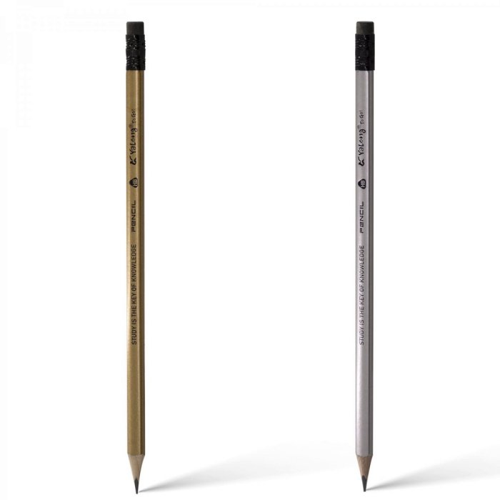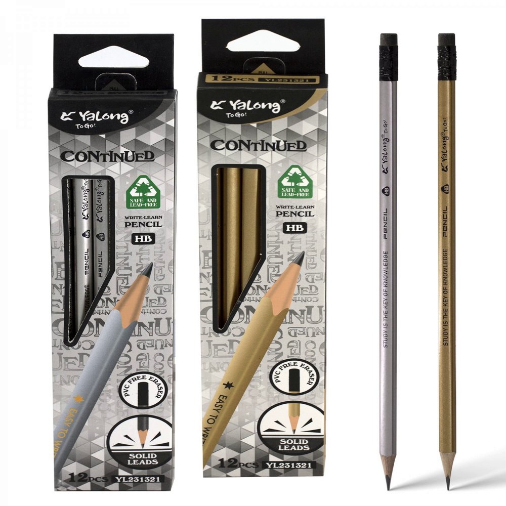 Карандаш чернографитный Yalong в деревянном трехгранном корпусе. Простой карандаш с ластиком поставляется заточенным. Грифель не царапает бумагу, не ломается, затачивание происходит аккуратно и легко. Твердость грифеля - HВ. Цвет корпуса - золото/серебро .