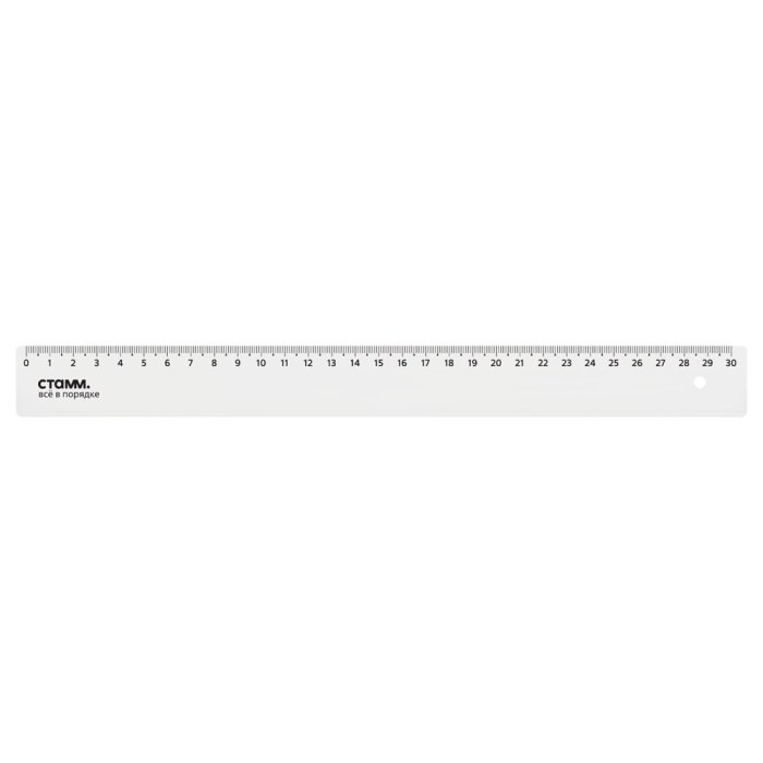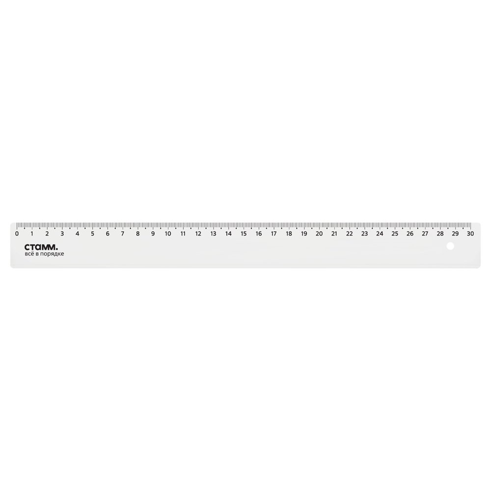 Линейка СТАММ – отличный помощник для создания ровных линий. Размер товара – 30 см, ширина – 30 мм. Изделие имеет безопасные закруглённые края и чёткую контрастную миллиметровую шкалу. Товар обладает гладкой глянцевой поверхностью и представлен в прозрачном цвете.