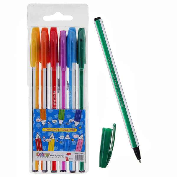 Набор шариковых ручек 6-и разных цветов. Пластиковый корпус в яркую полоску в цвет чернил. Диаметр пишущего узла 0,7 мм.