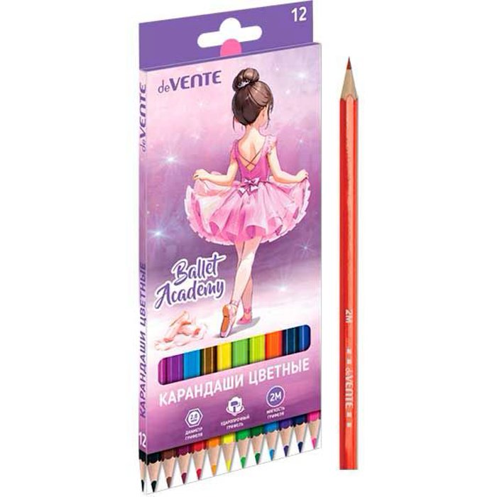 Карандаши цветные "deVENTE.Ballet Academy" 12 цветов, 2М, диаметр грифеля 2,8 мм, деревянные, шестигранные 5022535. Заточенные, насыщенные цвета и мягкое рисование.