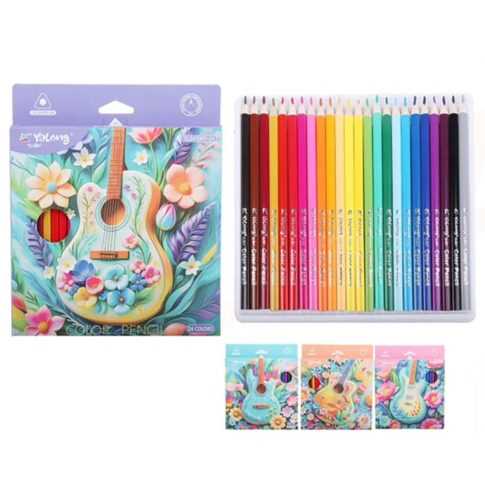 Карандаши трехгранные деревянные цветные Yalong 24 цвета. Яркие насыщенные цвета, устойчивы к выцветанию, высококачественный мягкий грифель. Предназначены для рисования и письма по бумаге, картону, дереву.