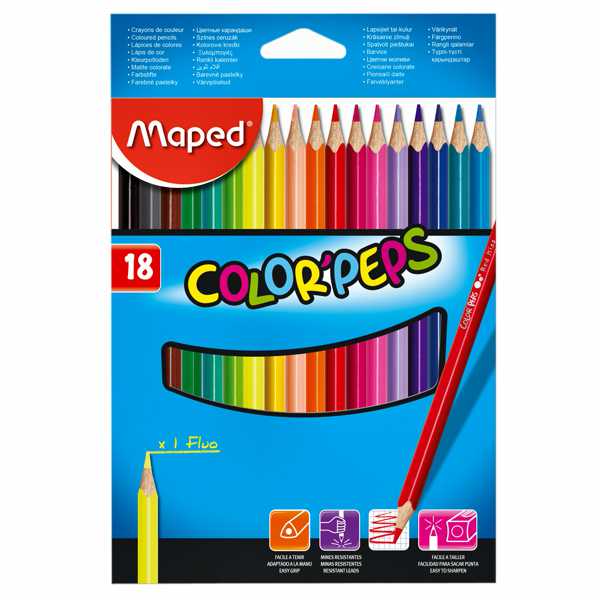 Цветные карандаши Color'Peps от Maped: серия ярких цветных карандашей удовлетворит все потребности детей. Соответствуют действующим стандартам качества детских игрушек. Мягкий и прочный грифель, легко затачивается, не трескается, диаметр 2,9 мм. Насыщенные цвета, 18 цв. Удобная трехгранная форма.
