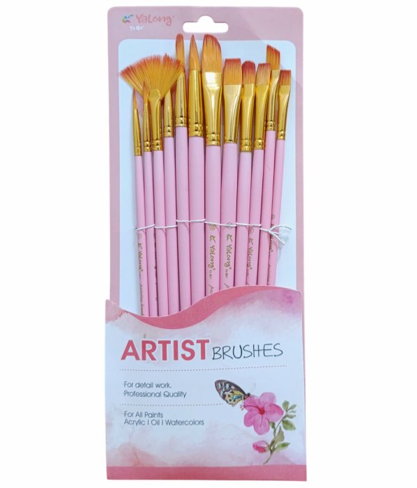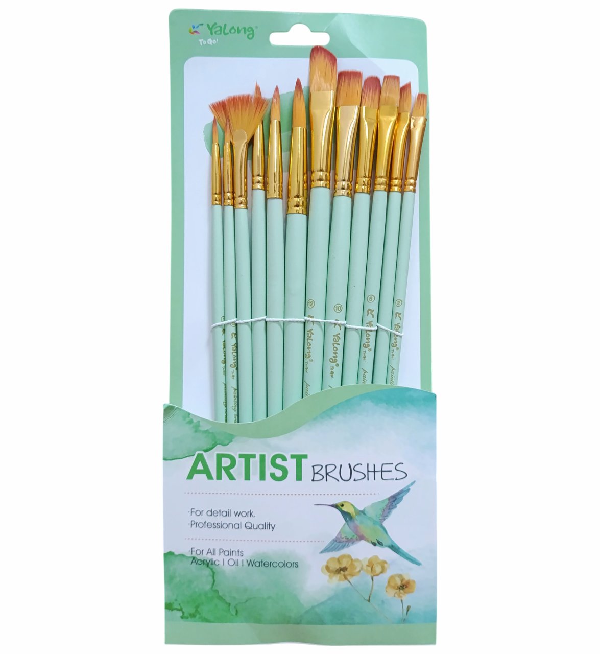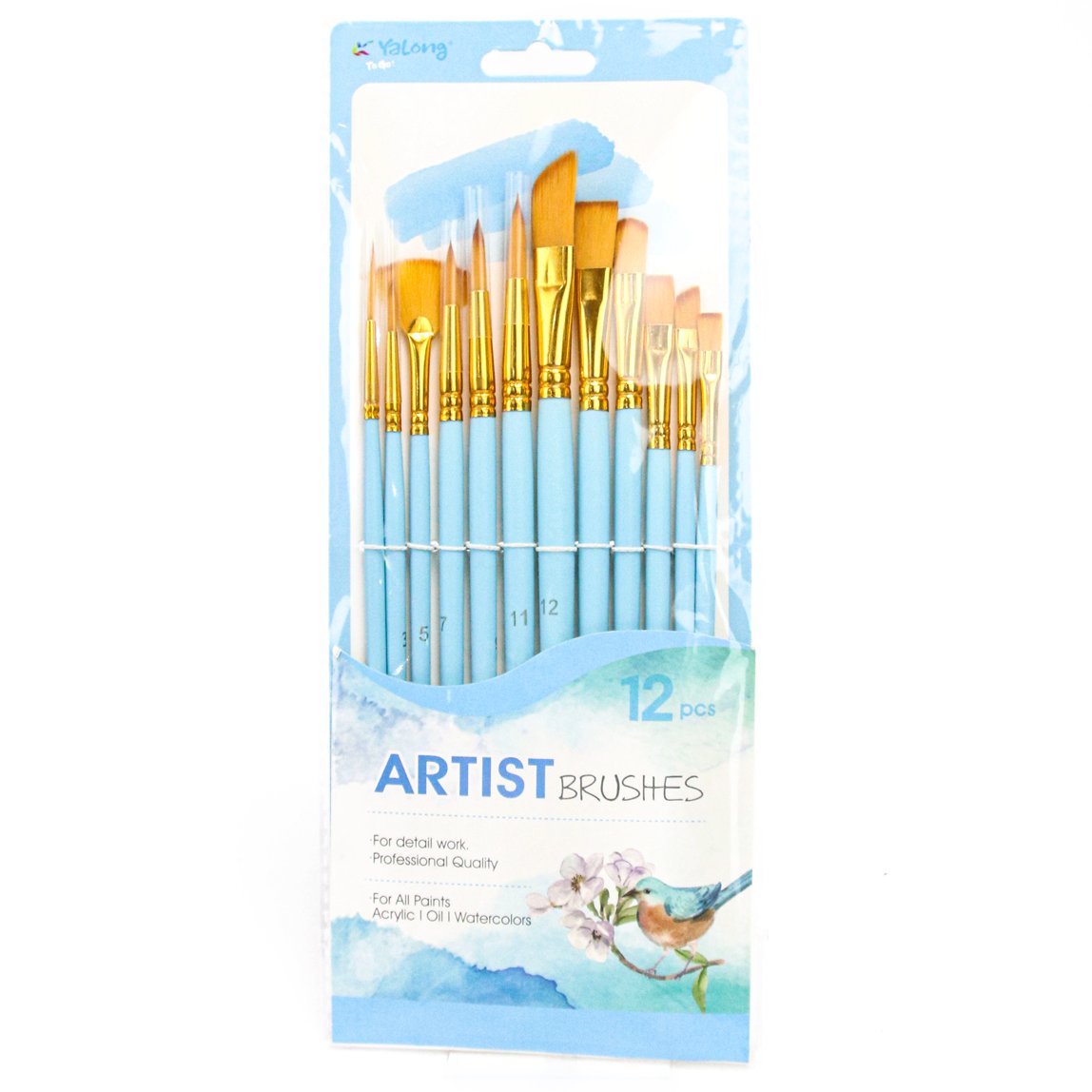 Набор кистей Yalong нейлон 12 шт, плоские №2, №4, №6, №8, №10, №12, круглые №1, №3, №7, №9, №11, веерная №5, деревянная ручка, блистер, европодвес. 3 цвета наборов в ассортименте.