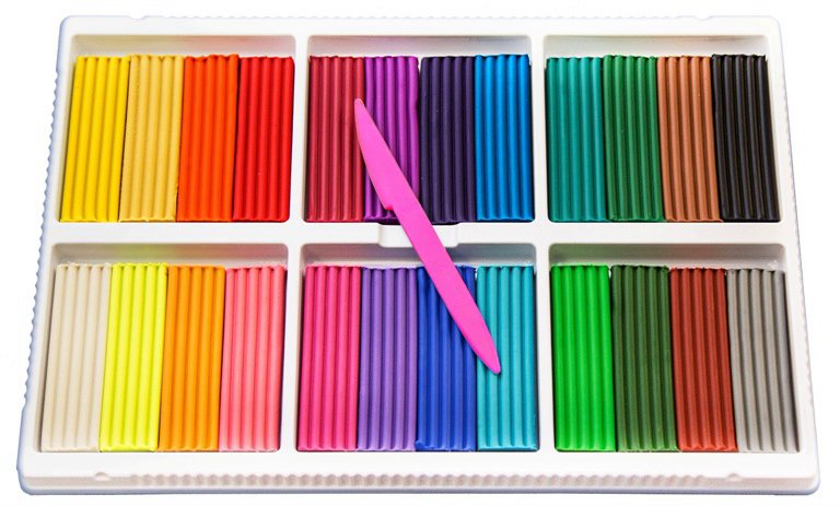 Пластилиновая масса не имеет запаха, не вызывает аллергических реакций, не токсична. В набор входят 24 брусочка различных цветов и стек.