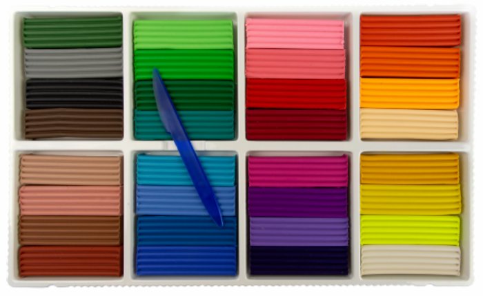 Пластилиновая масса не имеет запаха, не вызывает аллергических реакций, не токсична. В набор входят 24 брусочка различных цветов и стек.