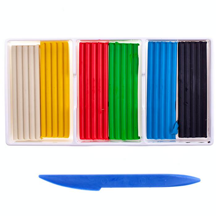 Пластилиновая масса не имеет запаха, не вызывает аллергических реакций, не токсична. В набор входят 6 брусочков различных цветов и стек.
