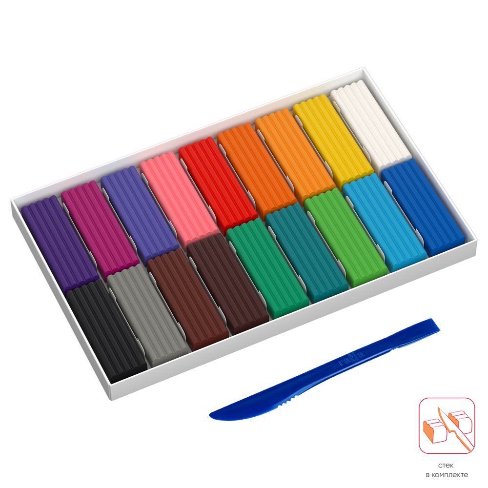 Набор цветного пластилина. 18 цветов. Яркие и сочные цвета. Не липнет к рукам, не оставляет жирных пятен. В комплекте идет пластиковый стек. Упакован в картонную коробочку.