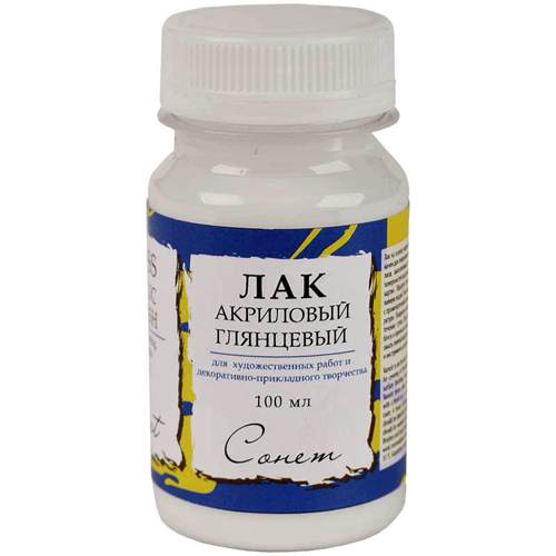 Лак акриловый, глянцевый, 100 мл. На основе водной акриловой дисперсии. Предназначен для завершающего покрытия работ, выполненных акриловыми красками, а также для использования в декоративных техниках (декупаж, кракелюр, роспись по различным поверхностям). Создавая на поверхности прочную пленку, акриловый лак «Сонет» защищает работу от воздействий внешней среды. Придает поверхности изделия законченный вид с глянцевым эффектом.